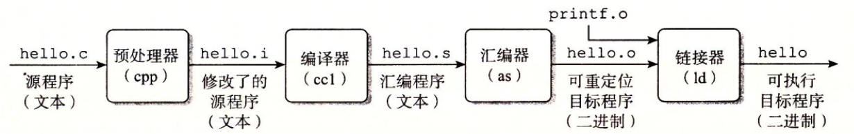注意,hello程序调用了 printf 函数,它是每个 C 编译器都提供的标准 C 库中的一个函数。printf 函数存在于一个名为 printf.o 的单独的预编译好了的目标文件中,而这个文件必须以某种方式合并到我们的 hello.o 程序中。